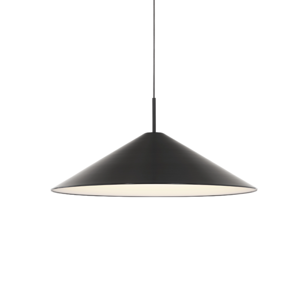 The Brolly lighting series demonstrates the strength of simplistic shapes. Precise and considered, these elegant lights display the kind of thoughtful, almost deceptive, simplicity that makes them timeless particulars in any decor. In this pendant version of the Brolly Lamp, the conical lampshade is magnified into diameters of 70 and 90 centimetres, their sharp volumes enhancing the architectural expression of the design. The concave diffuser spreads a soft and generous light that does not blind you when you are seated beneath the lamp. Let the pendant hover above the dining table or wherever pleasant light and a significant silhouette are sought.