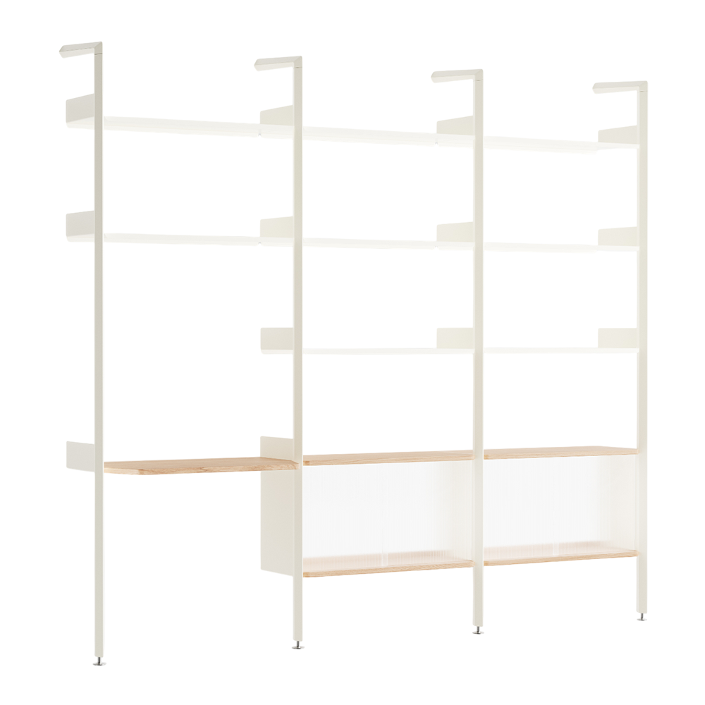 A modular shelving system with sculptural utility at its core, Rombe has been designed to adapt to the multifaceted needs of modern living. Available in 11 set configurations with the opportunity to add additional bays and shelves, the system grows and evolves with and around its surroundings.
