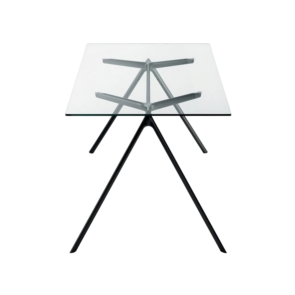 The geometry of the legs and the connection between structure and top have been reworked and DRY is now the perfect synthesis of the kind of design thinking that finds extraordinary compo-sitional richness in formal simplicity. The elegant aluminium base is broken down into an attractive shape thanks to a joint that becomes the key detail of the entire project. The glass top combines functionality and aesthetics in a single element, revealing the beauty of the structure.